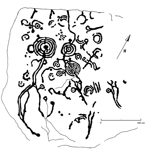 Composto de varias combinacións circulares con coviña central e sucos asociados, ademais de círculos simples con coviña central. Da combinación con maior cantidade de círculos, e da súa cazoleta central, parten dos sucos que algúns autores identifican con serpentiformes.