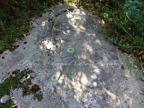 O borde dun camiño que vai ata o regato atopamos esta laxe a rente do chan rodeada de vexetación. Se aprecian catro coviñas e segundo a bibliografía, tamén un círculo con coviña central. En estado moi lamentable, sen señalización algunha.